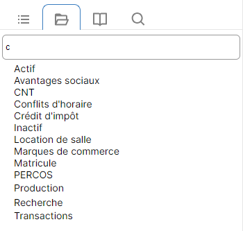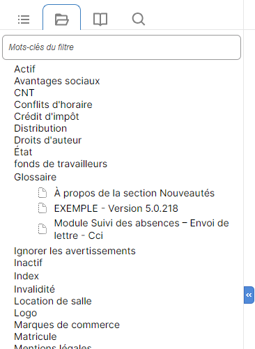 L'index peut être filtré en tapant du texte dans le champ Mots-clés du filtre. Comme par exemple, en tapant la lettre C dans le filtre, seuls les mots-clés contenant la lettre C seront affichés.