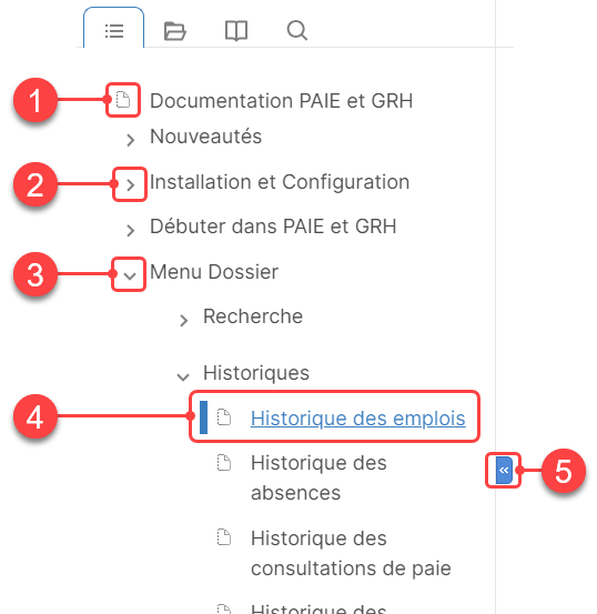 - Cliquez sur le double-chevron pour cacher la table des matières et augmenter l'espace disponible pour l'affichage du contenu.