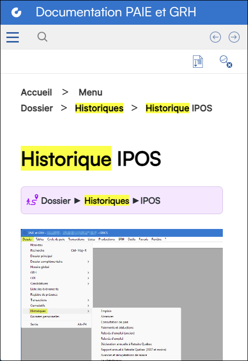 - Lorsque vous touchez l'un des résultats de recherche à l'écran, la rubrique correspondante s'affiche. Les termes de la recherche sont surlignés en jaune pour vous aider à les identifier rapidement à l'intérieur de la rubrique.