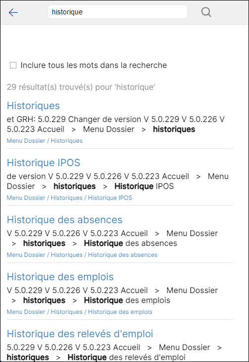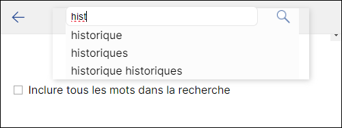 Si votre recherche a produit trop de résultats, vous pouvez la préciser en ajoutant des termes de recherche et en activant l'option Inclure tous les mots dans la recherche. Pour ce faire, touchez l'icône de recherche à nouveau. Les résultats de la recherche précédente se réafficheront.