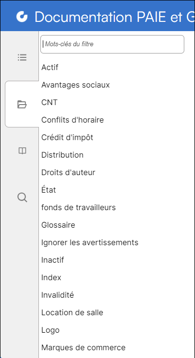 L'index peut être filtré en tapant du texte dans le champ Mots-clés du filtre. Comme par exemple, en tapant la lettre C dans le filtre, seuls les mots-clés contenant la lettre C seront affichés.
