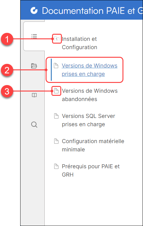 La table des matières est l'outil de navigation principal de la plateforme de documentation en ligne. Elle permet d'accéder à toutes les rubriques et est contruite de façon regrouper les rubriques en catégories et sous-catégories, en plus d'offrir une progression logique au lecteur.